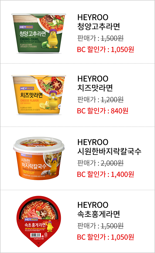 - BC카드로 HEYROO 컵라면 4종 구매 시,